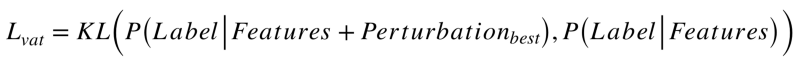 We predicted P(Label|Features)for the unlabeled image and we are trying to find the perturbation that maximizes the divergence between that distribution and the distribution of the prediction with perturbation. In this example, we use the Kullback–Leibler divergence, denoted as KL: